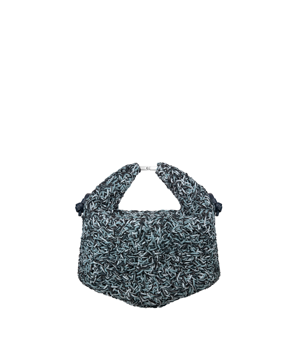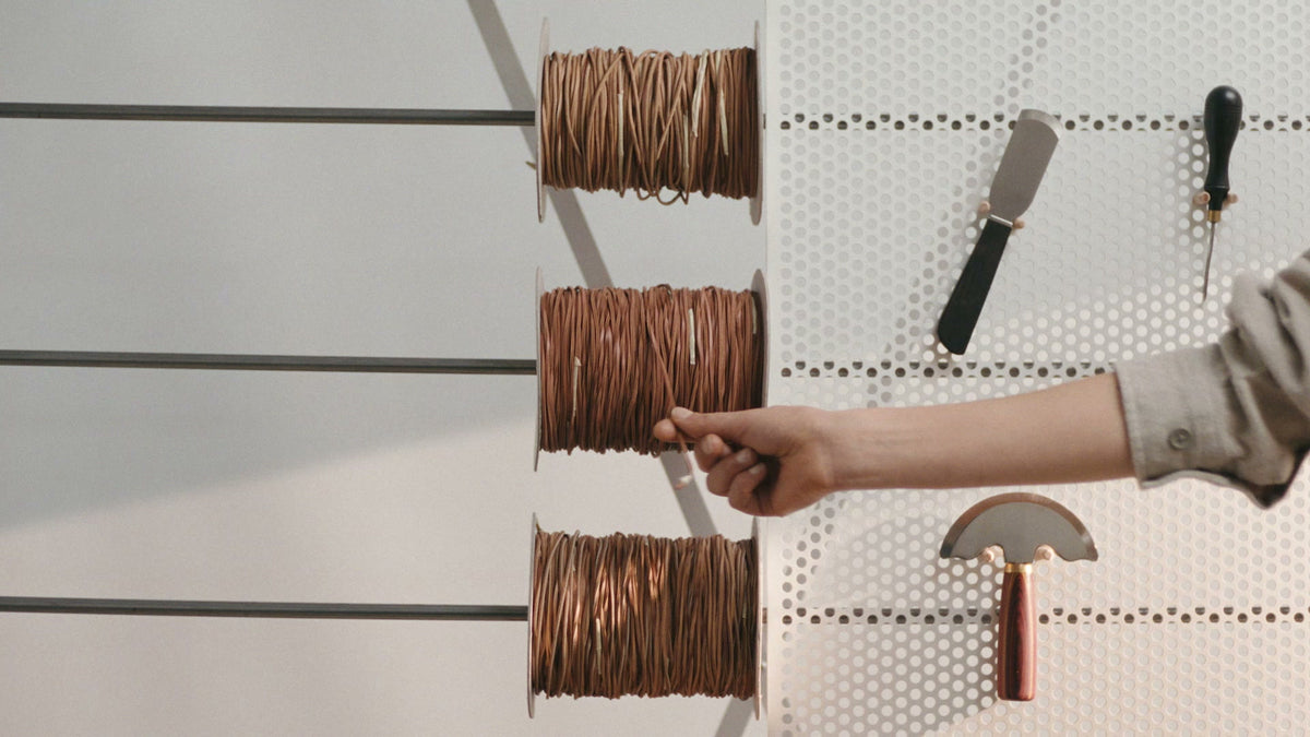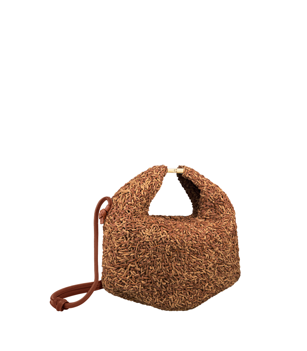 Su emblemática silueta se adorna con detalles entrelazados únicos realizados a mano, en la que cada cordón, elaborado con retales de cuero, cuenta una historia en torno al material.